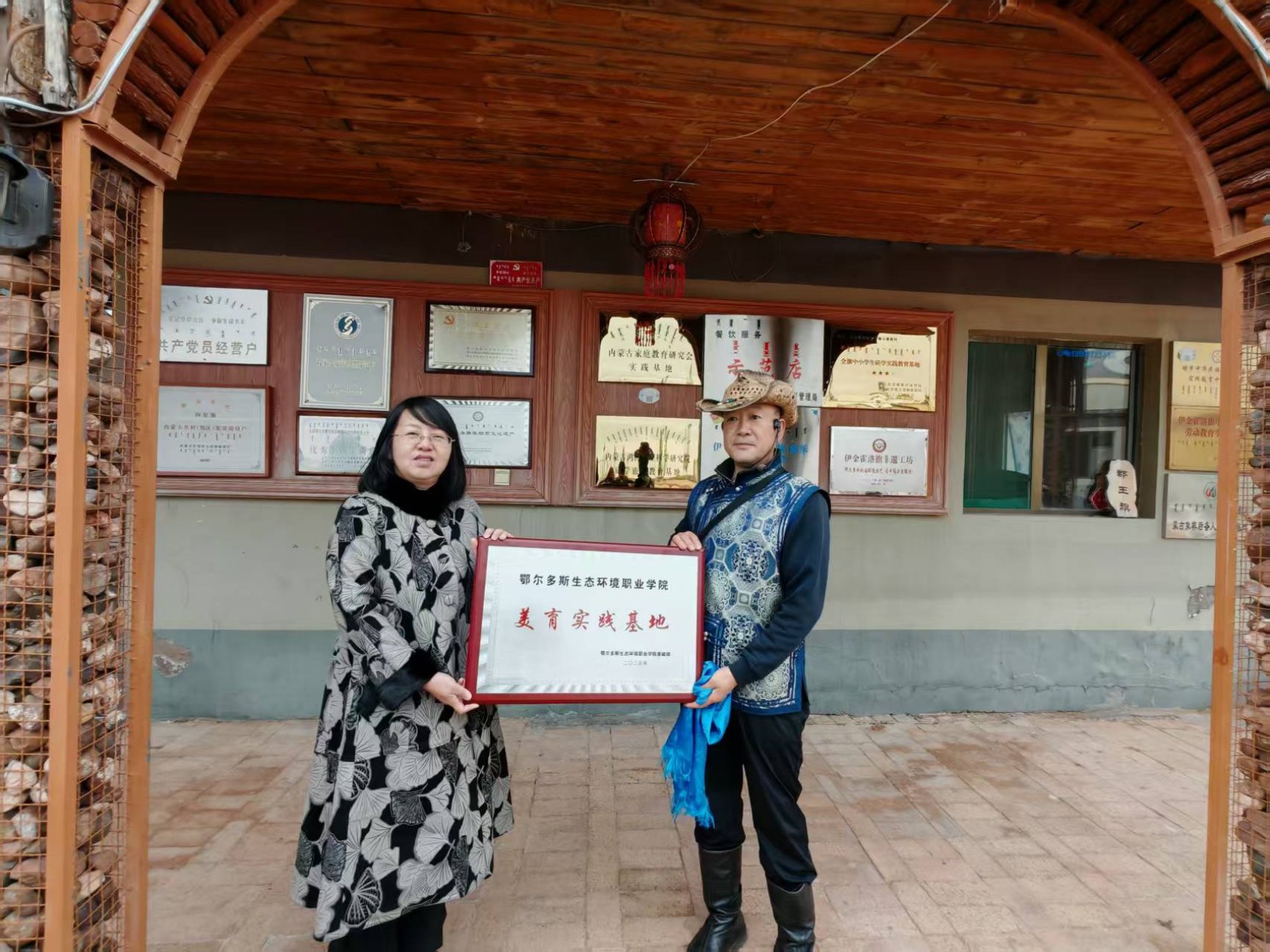 为进一步传承和弘扬中华民族优秀传统文化,整合校企优质资源共促美育实践,10月18日,学院基础部副主任刘晓丽与伊金霍洛旗苏布尔非遗嘎查查干锡力旅游度假村负责人吉人泰共同为学院美育实践基地挂牌,这是学院继达拉特旗赵大剪文化大院、杭锦旗敖特尔奶牛养殖专业合作社之外又新增的一处美育实践基地。
