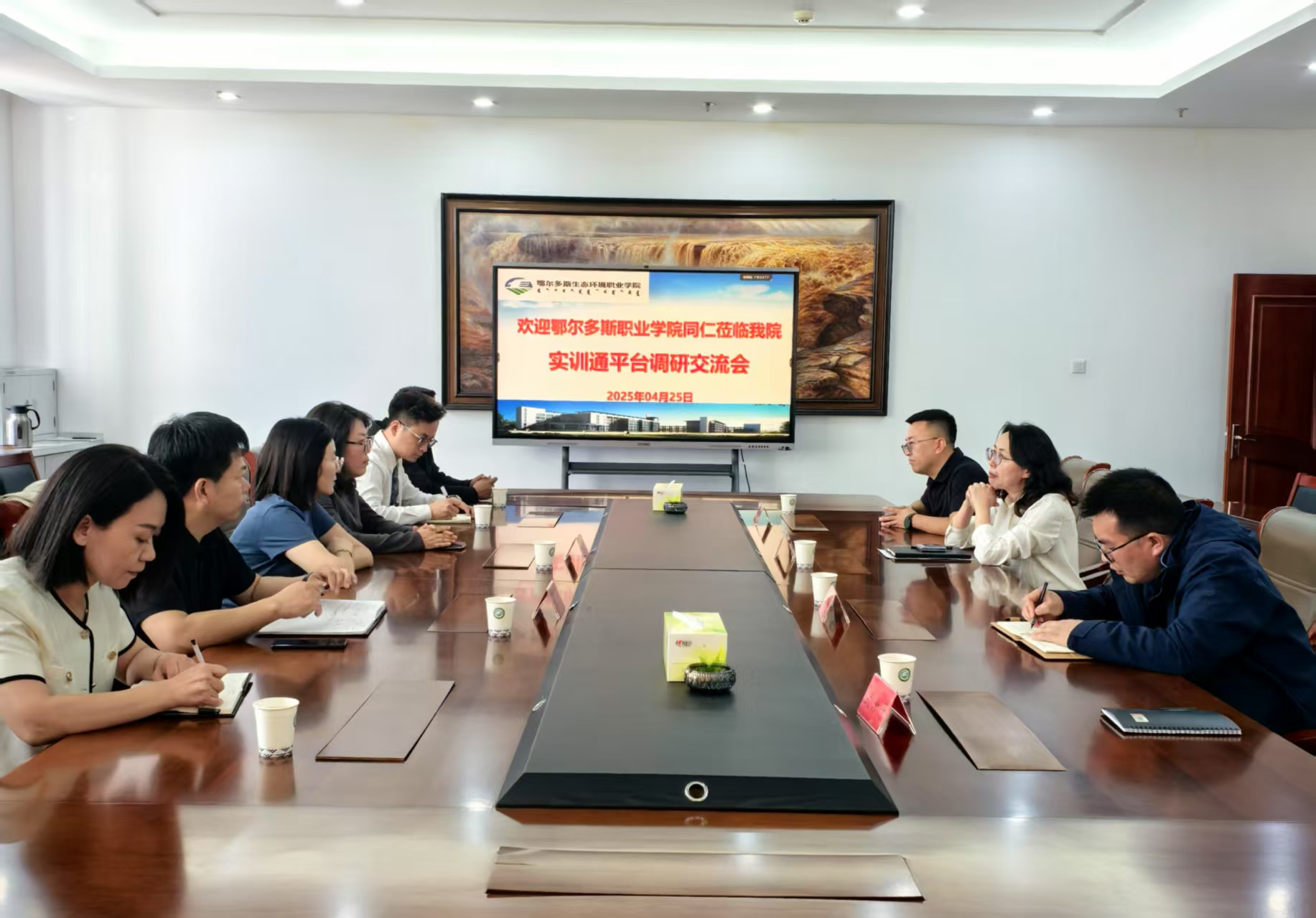 4月25日,鄂尔多斯职业学院教务处负责人到beat365就实训通平台的功能应用、运行成效及优化方向进行调研交流。beat365实训中心主任高海燕主持会议。