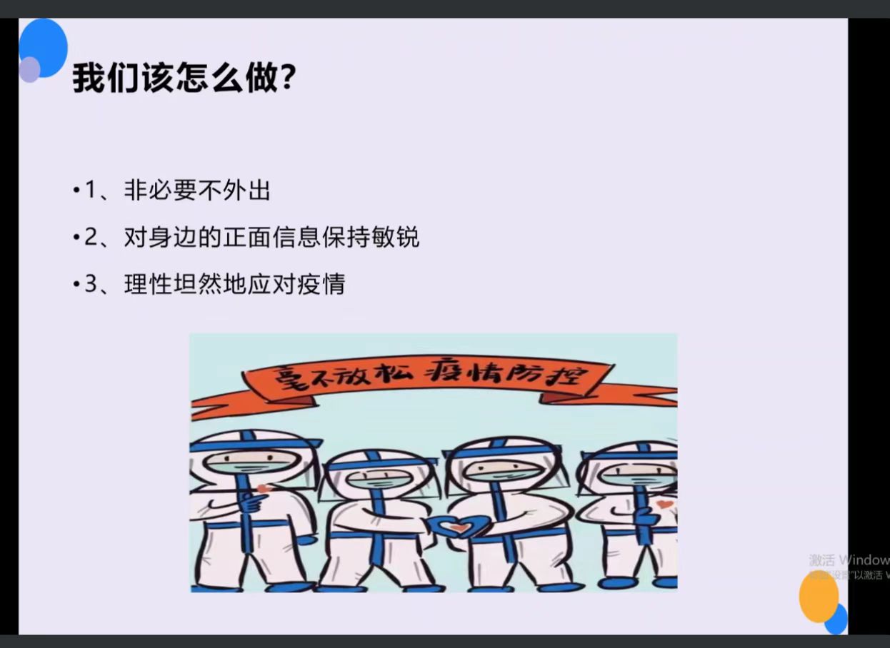 健康成长,为心护航。为缓解疫情给同学们带来的焦虑情绪,减轻同学们的线上学习的压力,提高心理承受能力,保证同学们的心理健康发展,11月26日,beat365举办“悦纳自我,化解压力”线上阳光心理大讲堂活动。本次活动由应用心理学研究生左露露担任主讲人,beat365部分学生参与。 活动伊始,主讲人让同学们观察几张动图,根据其运动速度的快慢来判断自己的心理压力程度,相同的图片在同学们眼中展现出的不同运动速度体现了同学们压力程度的差异。以此测试为基点,主讲人又向同学们展示了十二道心理测试题,同学们积极和主讲人进行互动,说出自己的答案,主讲人根据同学们的测试情况帮忙分析其象征意义,耐心温和地回答同学们提出的各种问题。随后,主讲人为同学们解释压力的含义及其来源。压力主要来源于内部压力和外部压力,弄清压力的来源可以及时采取有效措施以达到减轻或消除心理压力的目的。谈及调节情绪的方法时,同学们的方法不计其数,纷纷踊跃表达自己的想法,主讲人也向同学们分享了呼吸减压法和支解法等其他的方法。紧接着,主讲人为大家提供了他人互助型、提高自我型、自娱自乐型和乐于助人型四种类型的心理帮助。针对疫情期间,我们该如何高效前行,主讲人给我们提出了非必要不外出、对身边的正面信息保持敏锐、理性坦然地对待疫情的几点倡议,呼吁同学们放平心态,正视疫情。 本次活动的成功举办,有效地引导了同学们科学认识疫情,积极应对挑战和压力,极大地提高了同学们的心理素质,营造了健康积极的校园氛围。 (图文:马海迪、吴志钰 初审:吴志钰 复审:高晓薇 终审:巨国运)